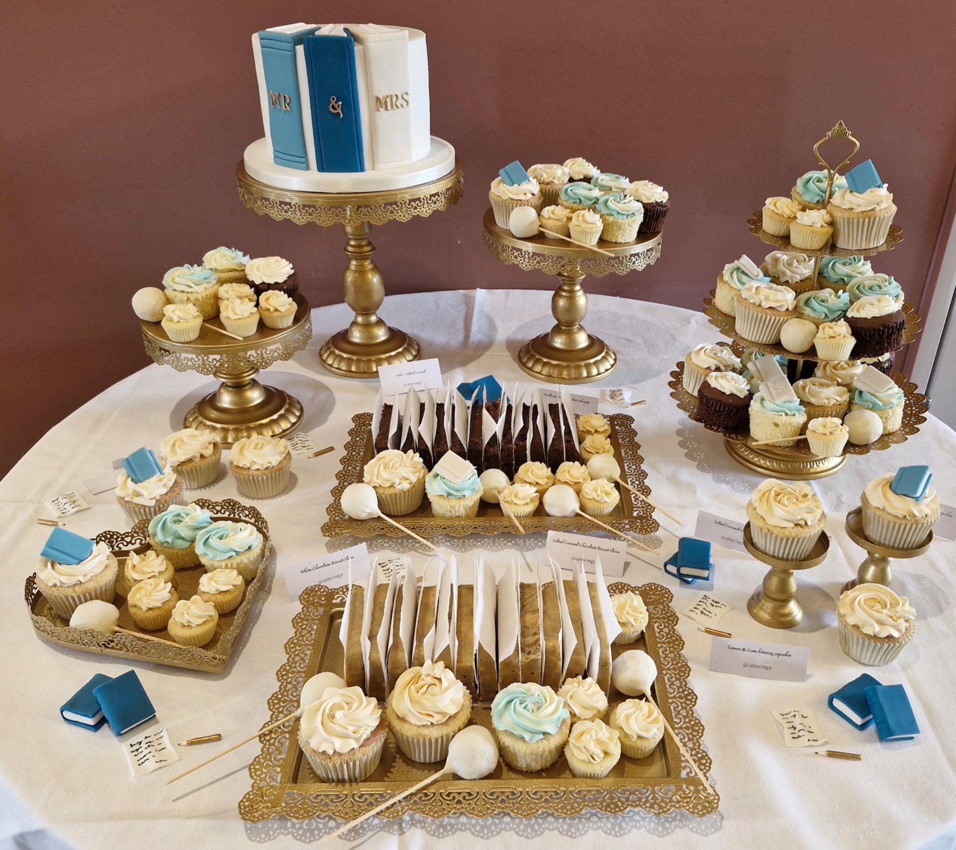 Laura and Dean's comments: "I wanted to drop you a line to say thank you SO so much for the glorious cake table on Saturday, it was everything we imagined and more!! Everyone loved the design and the taste — they were the hit of the drinks reception and fitted perfectly with our theme. The book cake was stunning too — the paper!! Your biscuit slices are the best gluten free thing I have tasted in my life. I've never had to compete with my husband for leftover gluten-free treats before but he thinks they're delicious too. We can't thank you enough Caroline, you were a joy to work with from start to finish and helped to make our wedding day extra special". (March 2026).